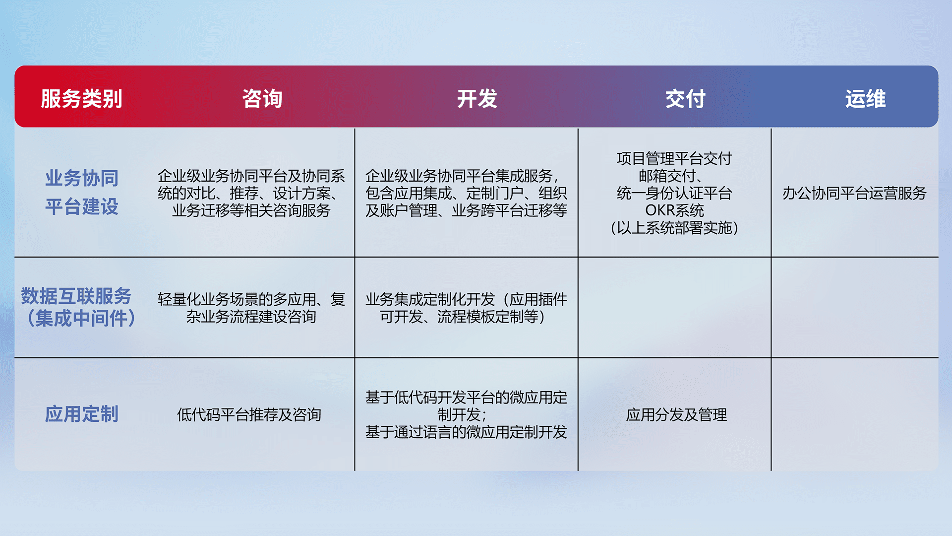 针对钉钉、、、、企微、、IDaas等平台级产品提供产品的规划、、、、方案、、、、交付、、、定制化开发等服务,,,实现如统一协同办公、、、、智能客户服务、、、、混合会议管理、、、、智能数据查询、、、等业务场景,,,实现数字化转型。。。。